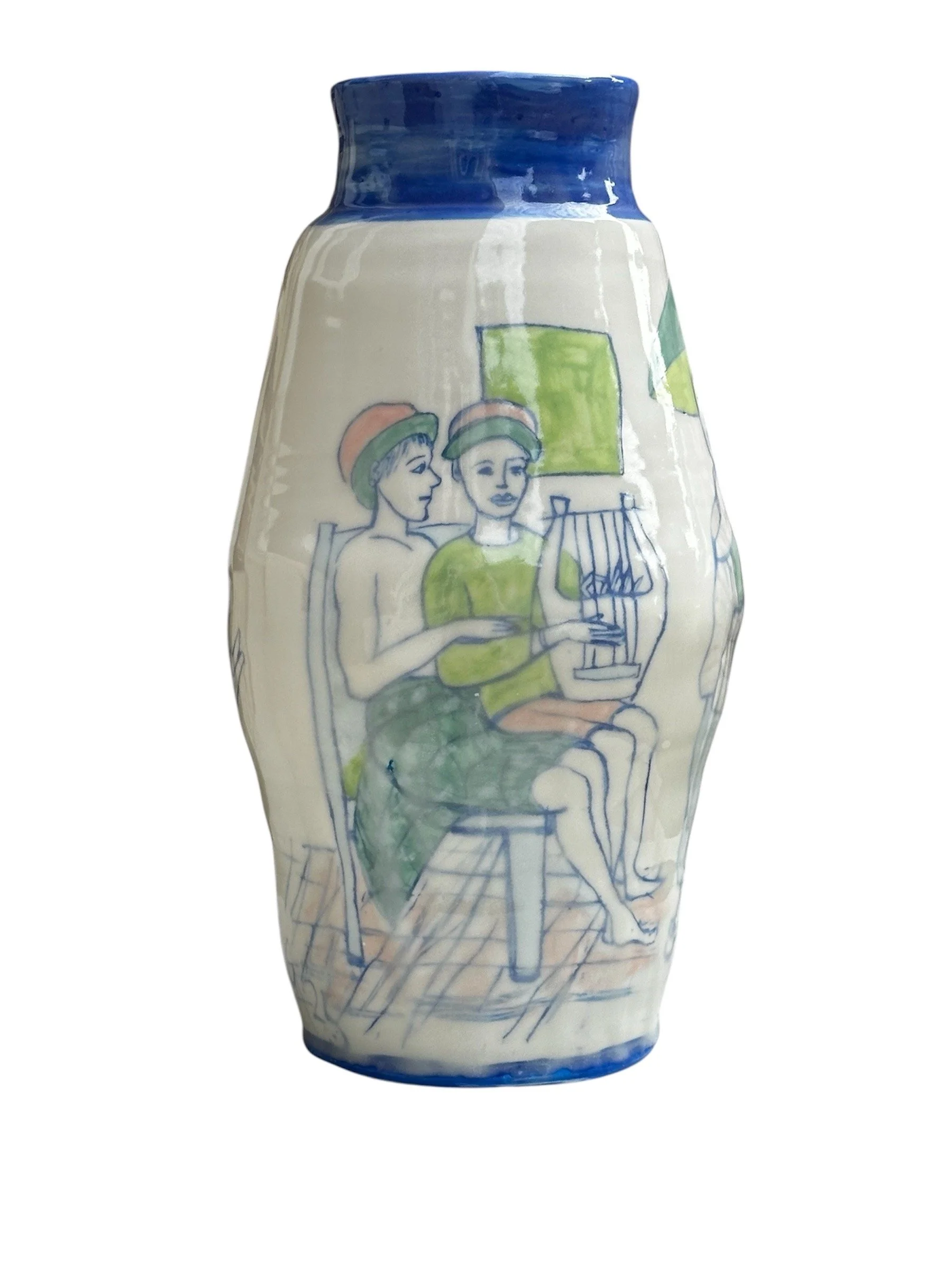 Storytelling vessels inspired by drawing from observation and visits to museums and galleries.15-25cm high x 7-9cm wide, they hold water, are decorative and functional. Altschuler’s playful aesthetic uses the abstract cup, beaker or tumbler shape, something we are used to holding intimately, in our hands and against our lips. She adds feet and a neck to create a vessel that is a sculptural form but is also a bud vase. Gail uses the clay or porcelain as a canvas, telling personal stories from her sketchbooks. The images of figures, faces and places are drawn using graphic techniques, Mishima inlay; etched lines filled with underglazes, Sgraffito; lines scratched through a colour, to reveal the background colour and colour washes under a transparent glaze. These graphic elements are all added before the clay is fired. Each vessel is hand built, uniquely shaped and illustrated with narrative images from her sketchbooks.